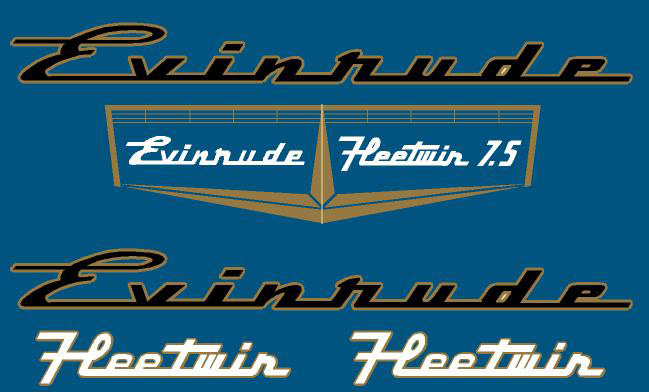 Decal set shown fits Evinrude Fleetwin Model 7522-7523 vintage antique outboard motors made in 1957. This set is shown on a blue background so that the white shows up.